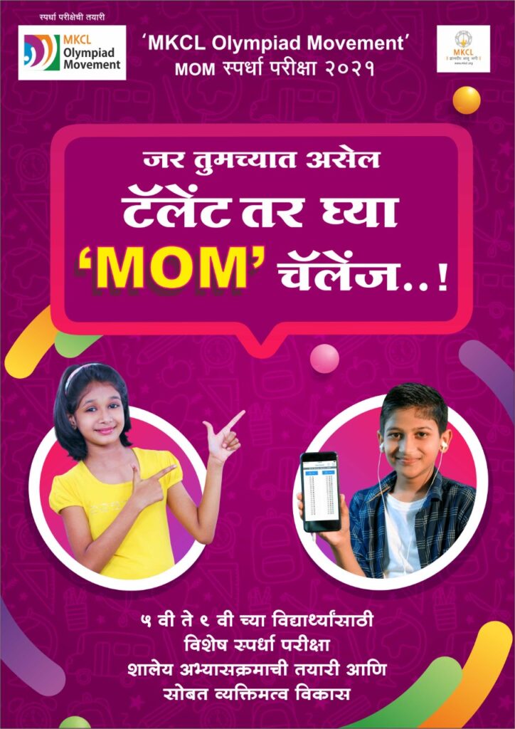 जीवनात यशस्वी होण्यासाठी शालेय अभ्यासक्रमासोबत विद्यार्थ्यांना सामान्य ज्ञान, नैतिक मूल्ये, संवाद कौशल्ये, Soft skills अर्थात मृदू कौशल्ये (मुलांच्या वयोगटानुसार शालेय विश्वातील प्रसंग तसेच त्यांच्या भावविश्वातील गोष्टी) गरजेची असतात. ५वी ते ९वी तील SSC बोर्डच्या मराठी, इंग्रजी व सेमी इंग्रजी माध्यमातील शालेय विद्यार्थ्यांची शैक्षणिक विषयांची तयारी आणि व्यक्तिमत्व विकासासाठी असलेले उपयुक्त अंगभूत गुण तपासण्यासाठी ‘MKCL ऑलिंपियाड मुव्हमेंट स्पर्धा-परीक्षा नोव्हेंबर २०२१ अर्थात ‘MOM’ ही राज्यस्तरीय स्पर्धा परीक्षा घेण्यात येणार आहे. परीक्षेतील प्रश्नप्रकार आणि प्रश्नांचे स्वरूप हे जागतिक पातळीवरील मानकांनुसार तयार केले गेले आहेत. या स्पर्धा परीक्षेतील विजयी विद्यार्थ्यांना प्रोत्साहनपर काही लाखांची परितोषिकेही दिले जाणार आहेत.