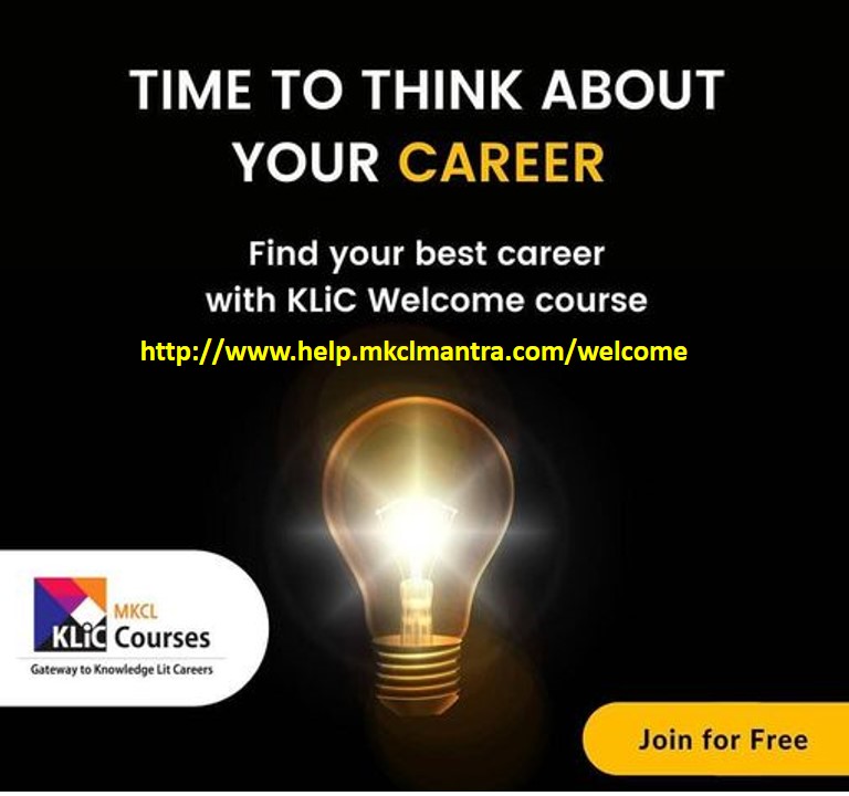 सर्वाना कळविण्यास आनंद होतो कि, MKCL मार्फत सर्व विद्यार्थ्यांना KLiC WelCome* हा उत्तम कोर्स मोफत देण्यात येत आहे. या मध्ये विद्यार्थ्यांना MKCL KLiC च्या खालील १६ कोर्सेस चा कंटेंट विनामुल्य शिकण्यास मिळणार आहे.